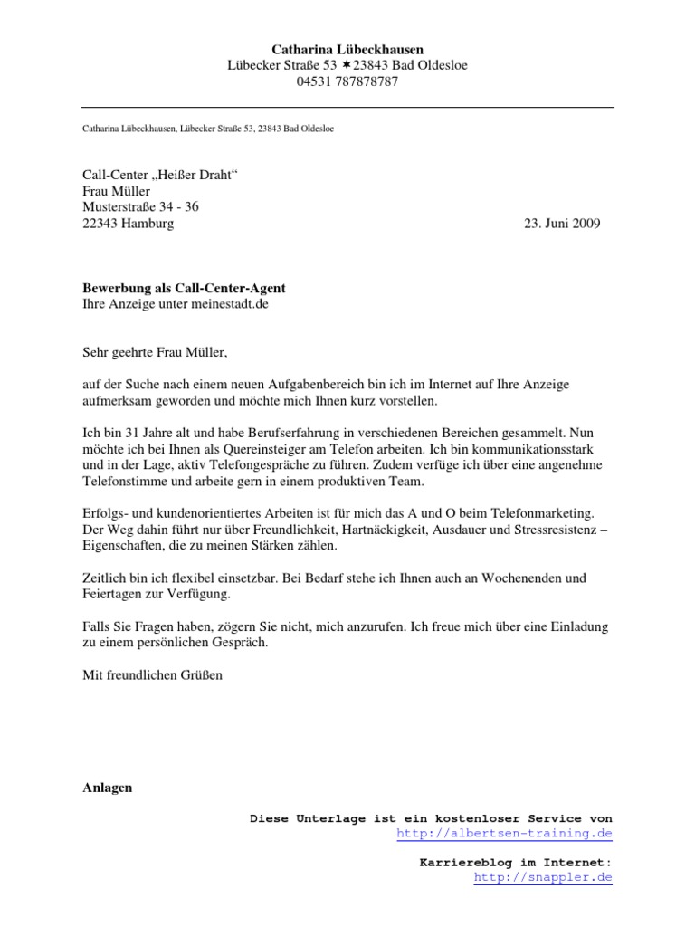 Muster Bewerbung Als Call Center Agent