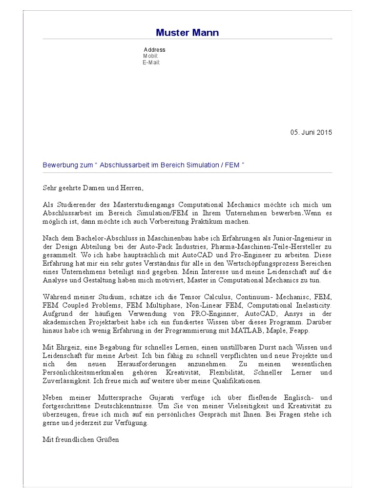 Sie überzeugen uns mit Ihren Studienleistungen und verfügen über ausgeprägte Fach- und Fremdsprachenkenntnisse. Bitte auf die Rechtschreibung achten. Schreibe ein Anschreiben über deine Abschlussarbeit das genau diesen Ansprechpartnerin überzeugt.